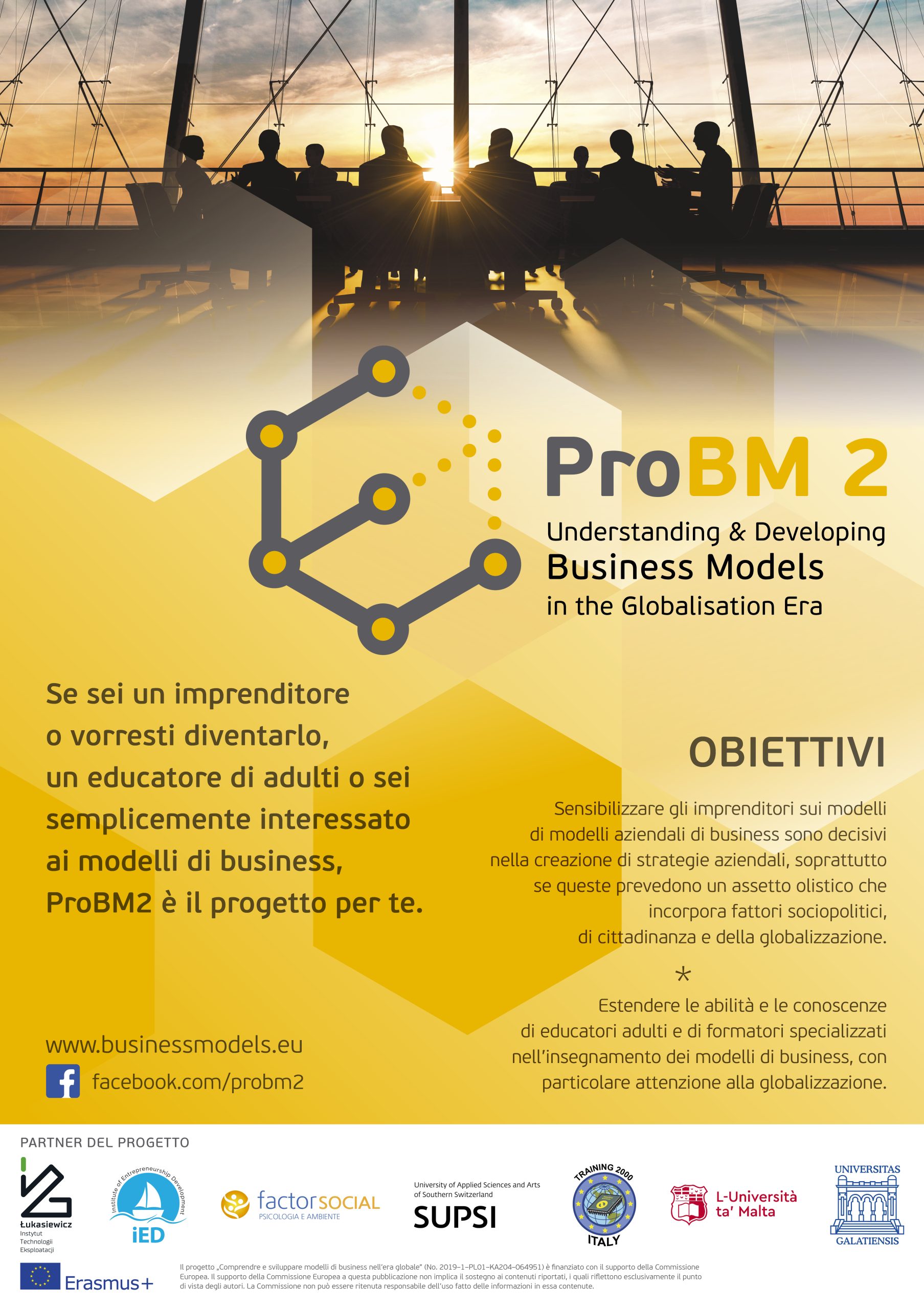 Ogni anno vengono fondate sempre più imprese, ma meno del 40% di queste superano i primi 5 anni di attività. Il problema principale è che molti imprenditori non danno importanza ai modelli di business, e sembrano non prestare abbastanza attenzione a questa fase di creazione dell’impresa. Se sei un imprenditore o vorresti diventarlo, un educatore adulto o sei semplicementi interessato ai modelli aziendali di business, ProBM2 è il progetto che fa per te. |